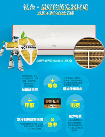 据行业内专家介绍,由于钛金的各项优异性能,使得其目前已广泛运用于航天、医疗、船舶、涂料等许多工业中,TCL空调创造性地将钛金运用于空调行业。